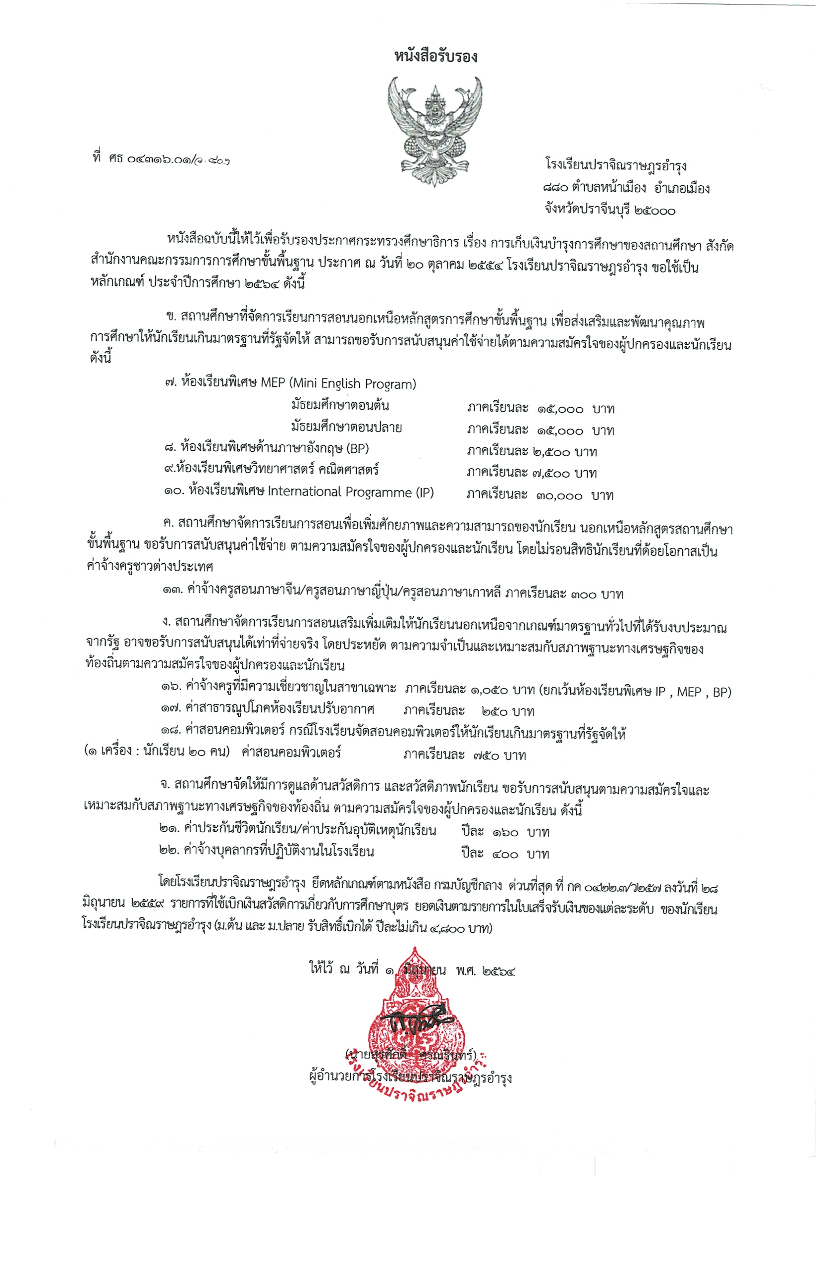 📒หนังสือรับรองประกาศกระทรวงศึกษาธิการ เรื่องการเก็บเงินบำรุงการศึกษาของสถานศึกษา